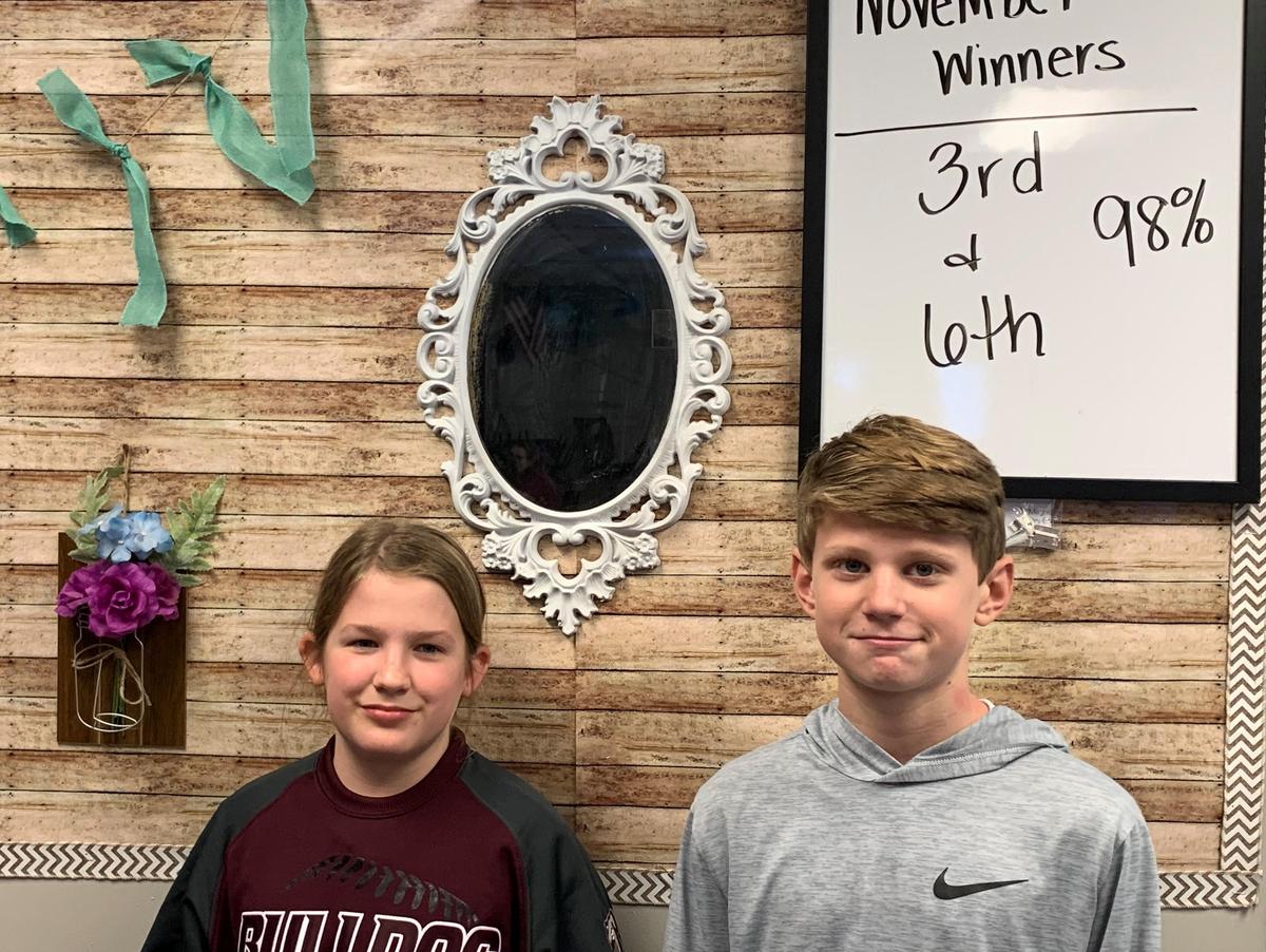 November Students of the Month November Students of the Month: 5th Grade: Colby Friend Mudiamond Lanear 6th Grade: Joshua Nause Abby Mowery 7th Grade: Eli Swearingen Lily Pigott 8th Grade: John Barry Boldin Shiloh Caughran
