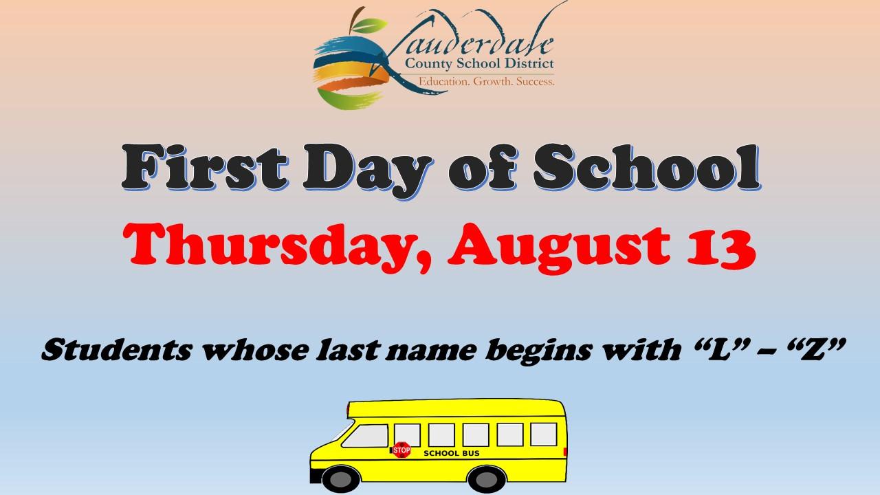 Back to School The first day of classes for students whose last name starts with the letter āLā through āZā will be Thursday, August 13, 2020.